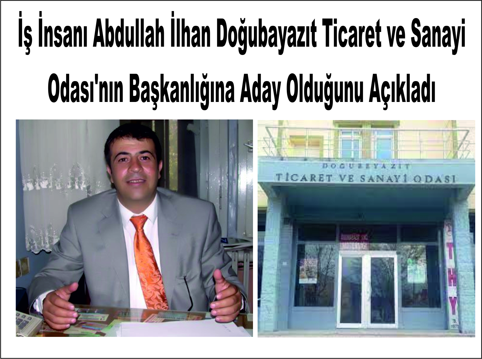 Doğubayazıt’lı iş İnsanlarından ve Eski İl Encümenlerinden, Abdullah İlhan Gazetemize gönderdiği yazılı açıklamada Doğubayazıt Ticaret ve Sanayi Odasının başkanlığına aday olduğunu belirtti ve şu ifadelere yer verdi ; “Sekiz ay sonraki seçim için hayra yönelik bir önerim ve bir dileğim var. Doğubayazıt’ın esnafı, mesleki esnafı ve tüccarı artık bizi temsil eden kişi şunu demelidir kendine;