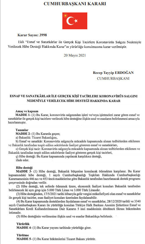 Cumhurbaşkanı Recep Tayyip Erdoğan'ın Pazartesi günü açıkladığı 'Covid-19'dan etkilenen esnafa verilecek hibe desteği'ne ilişkin karar Resmi Gazete'de yayımlandı.